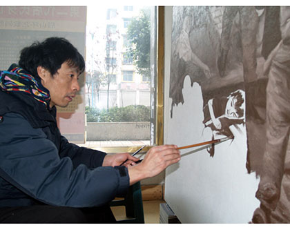 2009年1月阎晓庆在工作室绘制巨幅油画